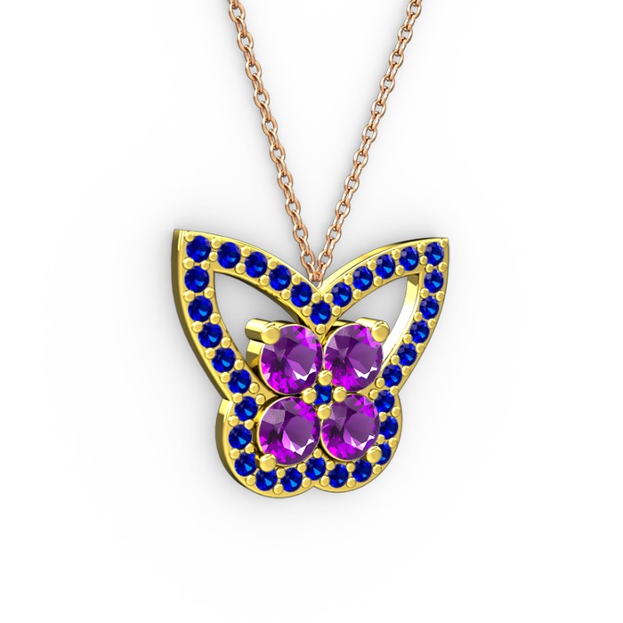 Lab safir ve ametist 925 ayar altın kaplama gümüş kolye (40 cm rose altın rolo zincir)