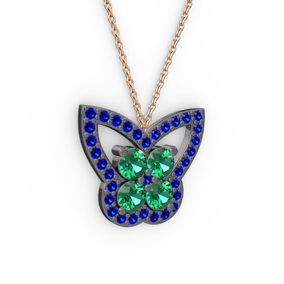 Lab safir ve yeşil kuvars 925 ayar siyah rodyum kaplama gümüş kolye (40 cm rose altın rolo zincir)