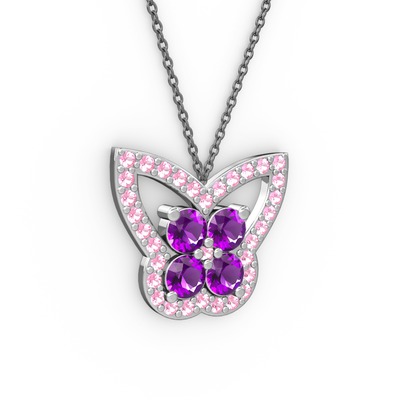 Pembe kuvars ve ametist 18 ayar beyaz altın kolye (40 cm gümüş rolo zincir)
