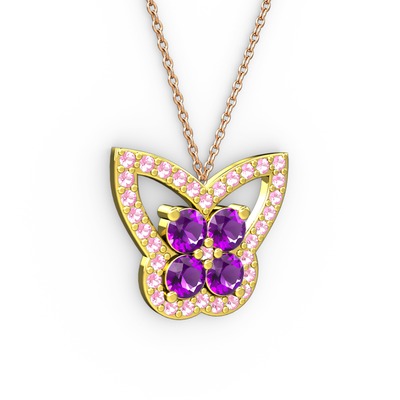 Pembe kuvars ve ametist 8 ayar altın kolye (40 cm gümüş rolo zincir)