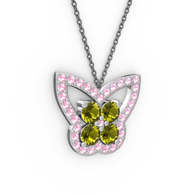 Pembe kuvars ve peridot 18 ayar beyaz altın kolye (40 cm gümüş rolo zincir)