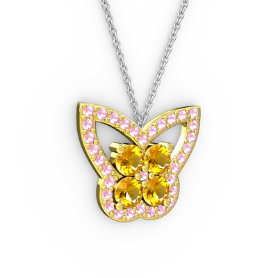 Pembe kuvars ve sitrin 14 ayar altın kolye (40 cm beyaz altın rolo zincir)