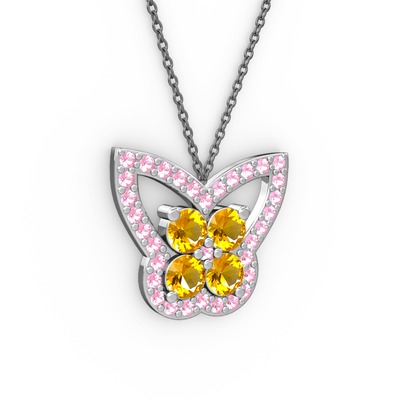 Pembe kuvars ve sitrin 18 ayar beyaz altın kolye (40 cm gümüş rolo zincir)