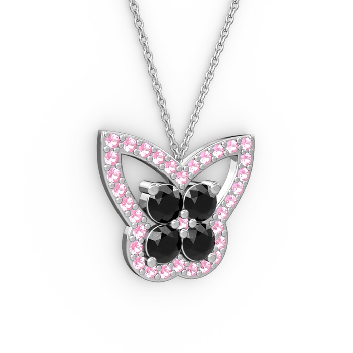 Pembe kuvars ve siyah zirkon 925 ayar gümüş kolye (40 cm beyaz altın rolo zincir)