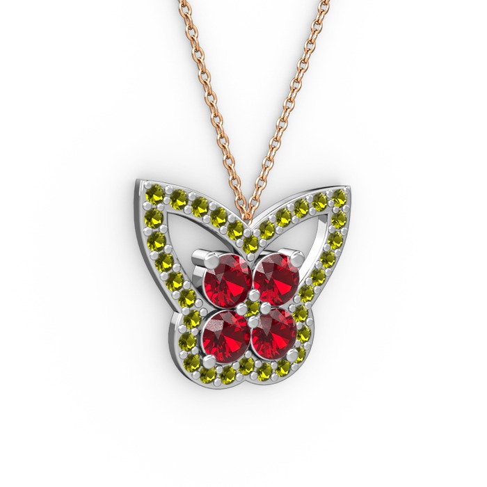 Peridot ve garnet 18 ayar beyaz altın kolye (40 cm gümüş rolo zincir)