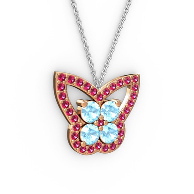Rodolit garnet ve akuamarin 925 ayar rose altın kaplama gümüş kolye (40 cm beyaz altın rolo zincir)