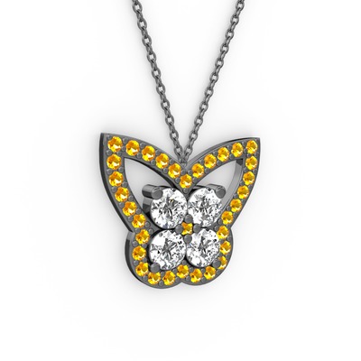 Sitrin ve beyaz zirkon 925 ayar siyah rodyum kaplama gümüş kolye (40 cm gümüş rolo zincir)