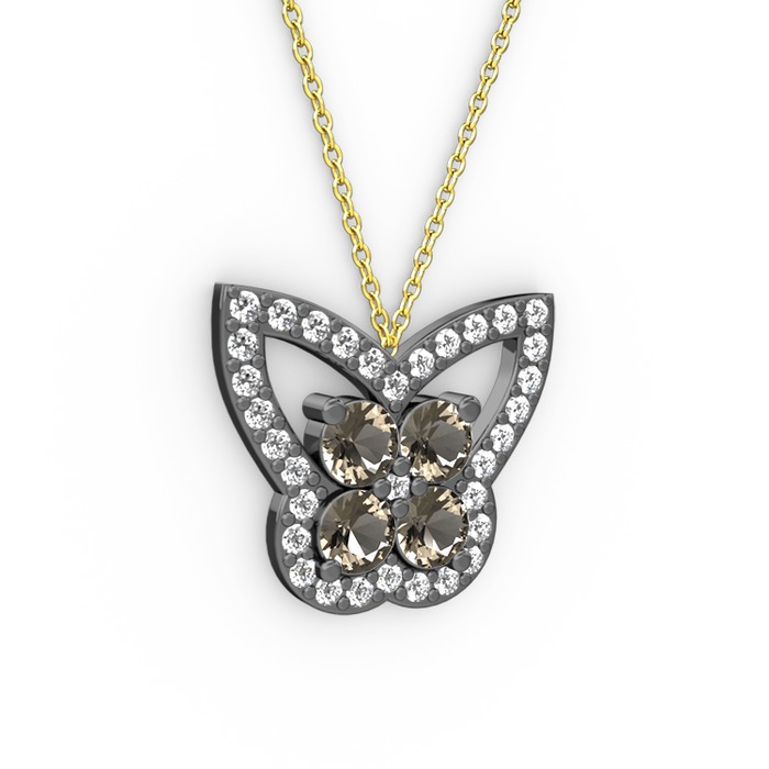 Swarovski ve dumanlı kuvars 925 ayar siyah rodyum kaplama gümüş kolye (40 cm altın rolo zincir)