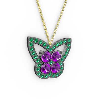 Yeşil kuvars ve ametist 925 ayar siyah rodyum kaplama gümüş kolye (40 cm altın rolo zincir)