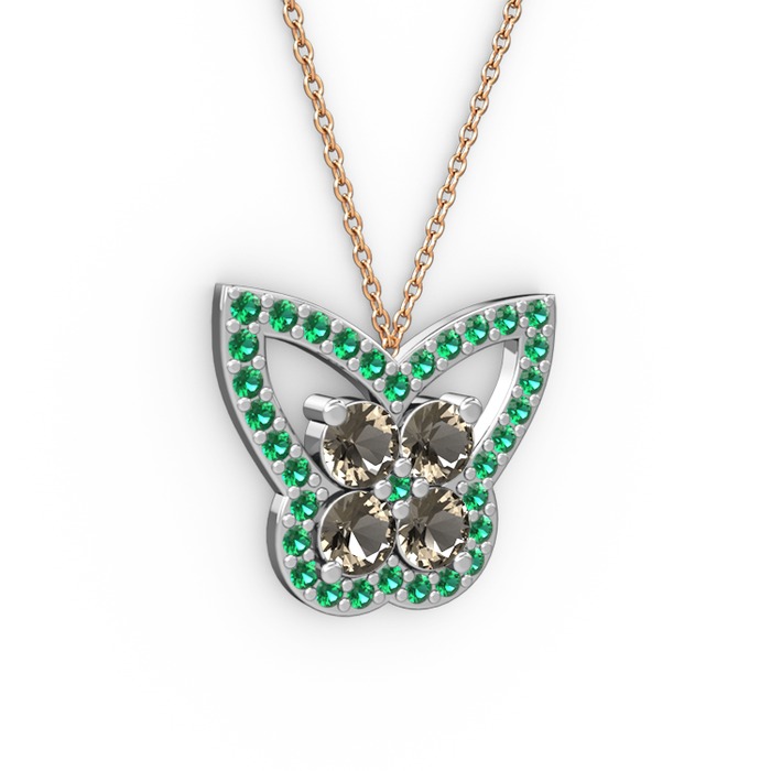 Yeşil kuvars ve dumanlı kuvars 14 ayar beyaz altın kolye (40 cm rose altın rolo zincir)