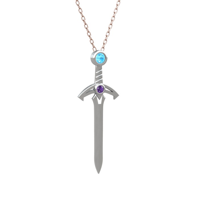 Akuamarin ve ametist 18 ayar beyaz altın kolye (40 cm rose altın rolo zincir)