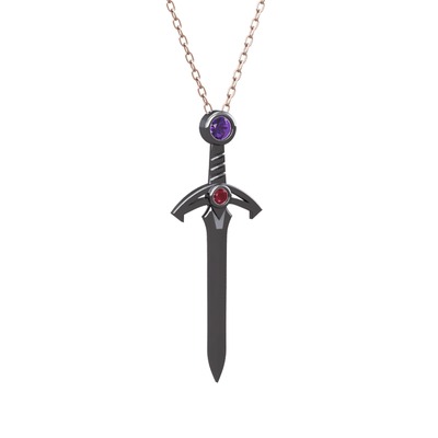 Ametist ve kök yakut 925 ayar siyah rodyum kaplama gümüş kolye (40 cm gümüş rolo zincir)