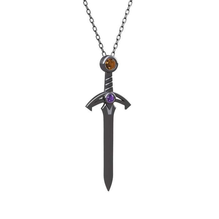 Kılıç Kolye - Dumanlı kuvars ve ametist 925 ayar siyah rodyum kaplama gümüş kolye (40 cm gümüş rolo zincir)