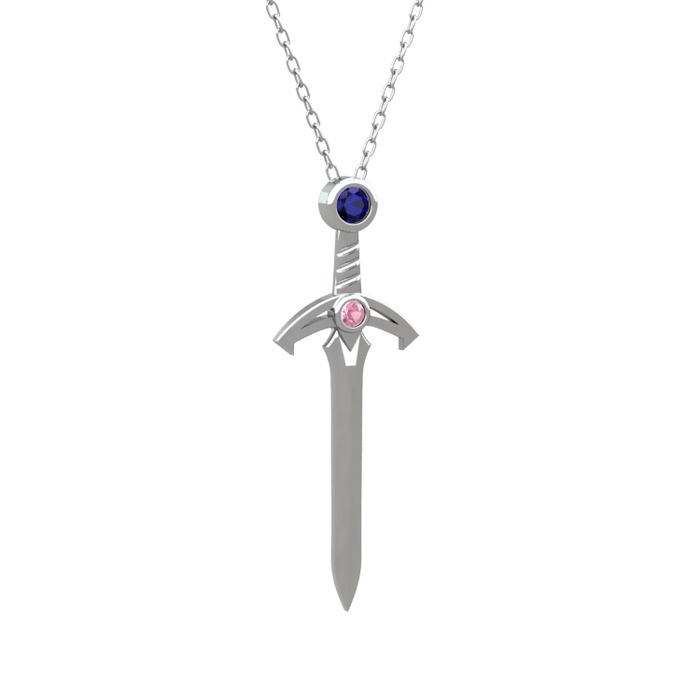 Lab safir ve pembe kuvars 14 ayar beyaz altın kolye (40 cm gümüş rolo zincir)