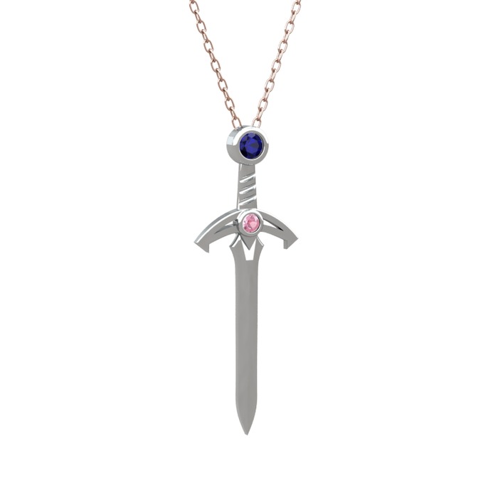 Lab safir ve pembe kuvars 18 ayar beyaz altın kolye (40 cm rose altın rolo zincir)