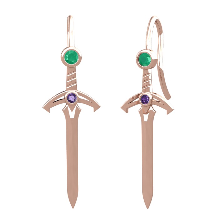 Kök zümrüt ve ametist 8 ayar rose altın küpe