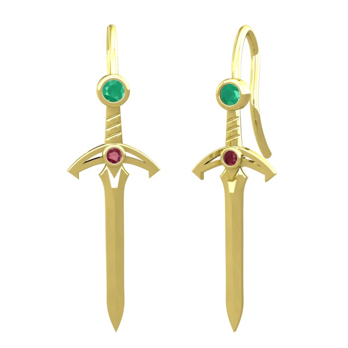 Kök zümrüt ve kök yakut 18 ayar altın küpe