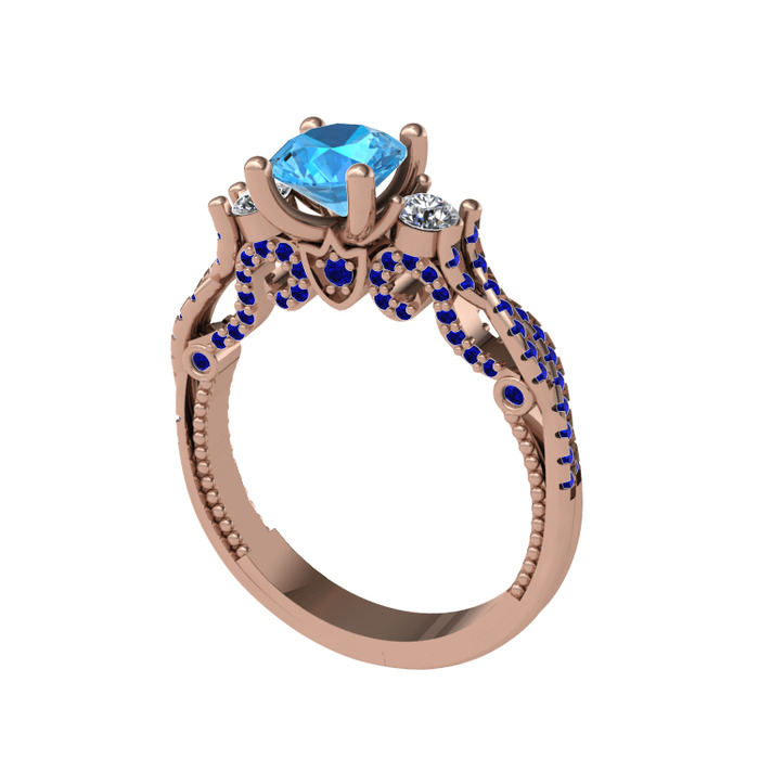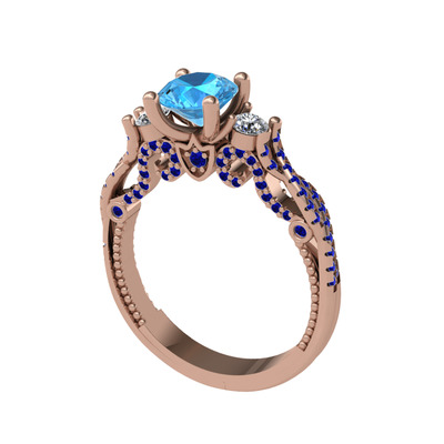 Akuamarin, beyaz zirkon ve lab safir 14 ayar rose altın yüzük