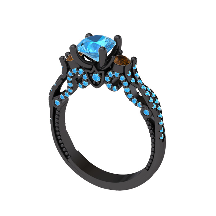 Akuamarin ve dumanlı kuvars 925 ayar siyah rodyum kaplama gümüş yüzük