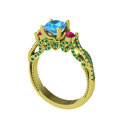 Akuamarin, rodolit garnet ve yeşil kuvars 925 ayar altın kaplama gümüş yüzük