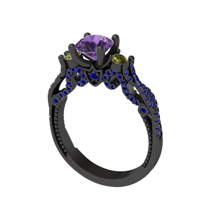 Ametist, peridot ve lab safir 925 ayar siyah rodyum kaplama gümüş yüzük