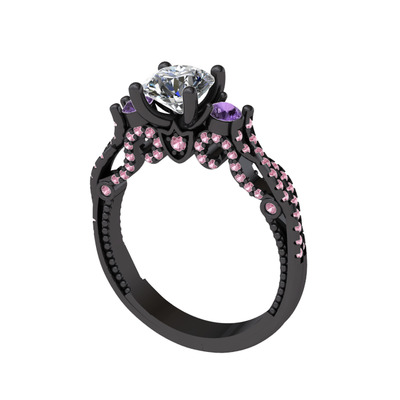 Beyaz zirkon, ametist ve pembe kuvars 925 ayar siyah rodyum kaplama gümüş yüzük