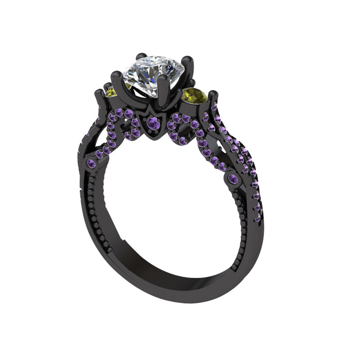Beyaz zirkon, peridot ve ametist 925 ayar siyah rodyum kaplama gümüş yüzük