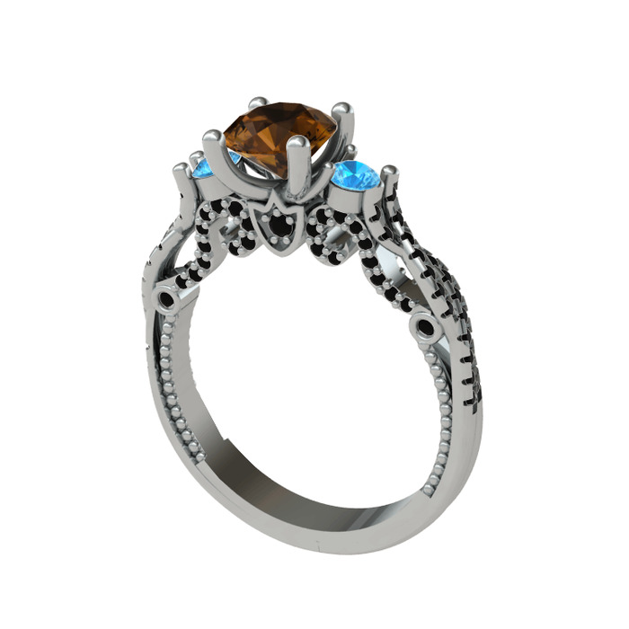 Dumanlı kuvars, akuamarin ve siyah zirkon 14 ayar beyaz altın yüzük
