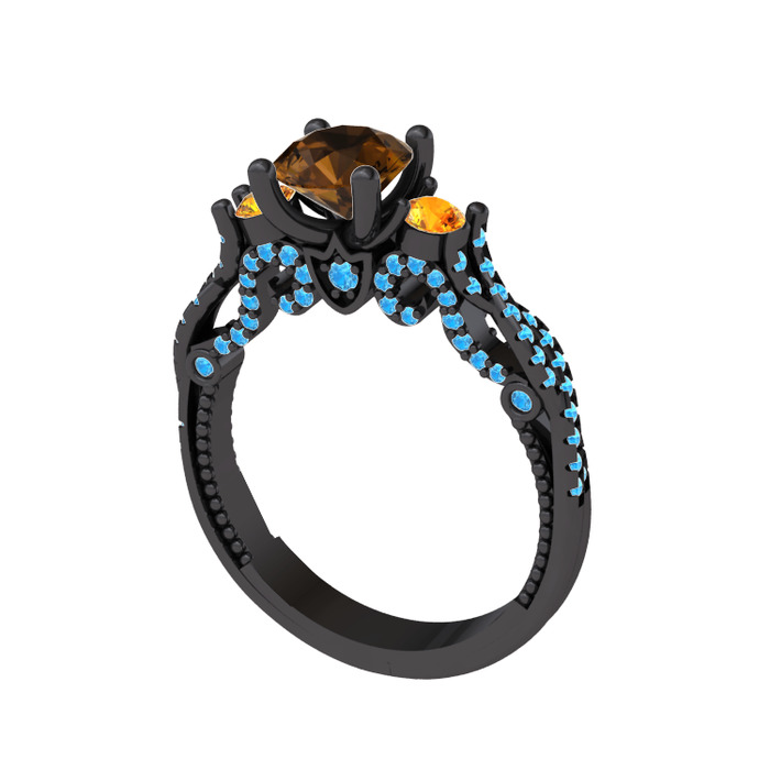 Dumanlı kuvars, sitrin ve akuamarin 925 ayar siyah rodyum kaplama gümüş yüzük