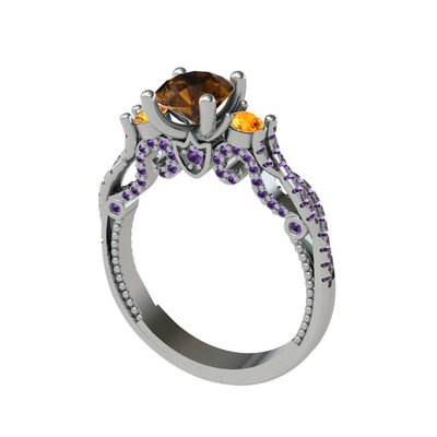 Dumanlı kuvars, sitrin ve ametist 14 ayar beyaz altın yüzük