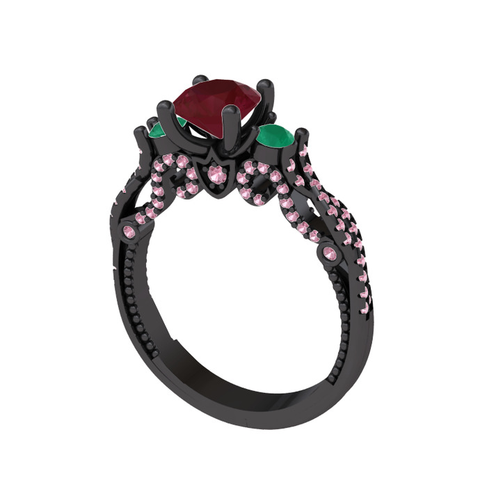 Kök yakut, yeşil kuvars ve pembe kuvars 925 ayar siyah rodyum kaplama gümüş yüzük