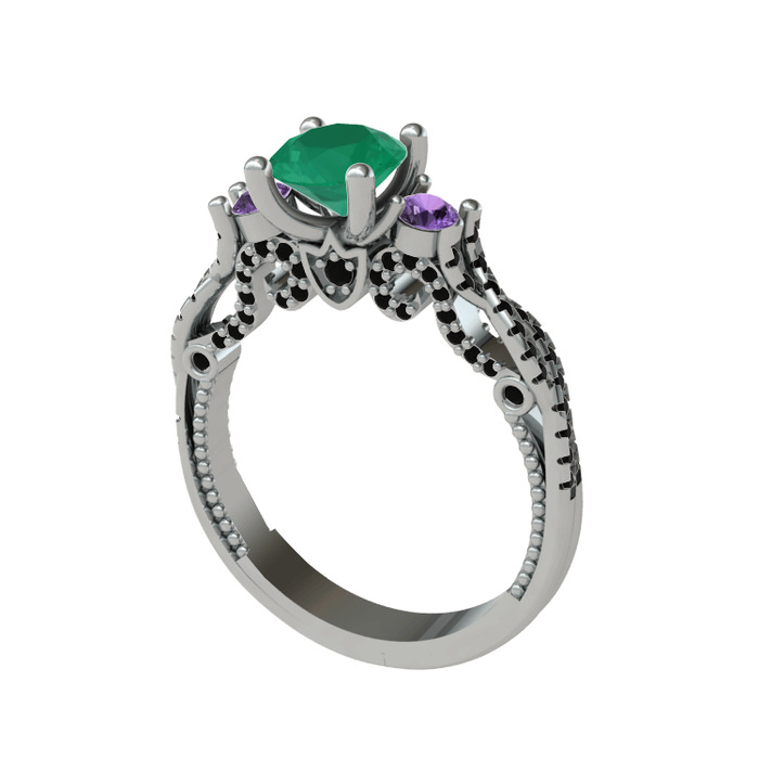 Kök zümrüt, ametist ve siyah zirkon 8 ayar beyaz altın yüzük