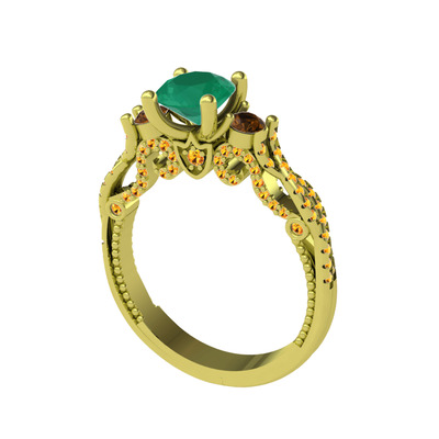 Kök zümrüt, dumanlı kuvars ve sitrin 14 ayar altın yüzük