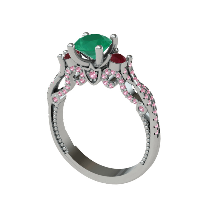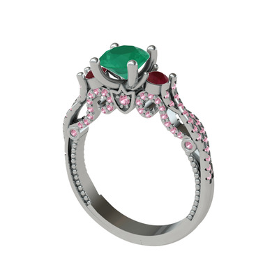 Kök zümrüt, kök yakut ve pembe kuvars 18 ayar beyaz altın yüzük