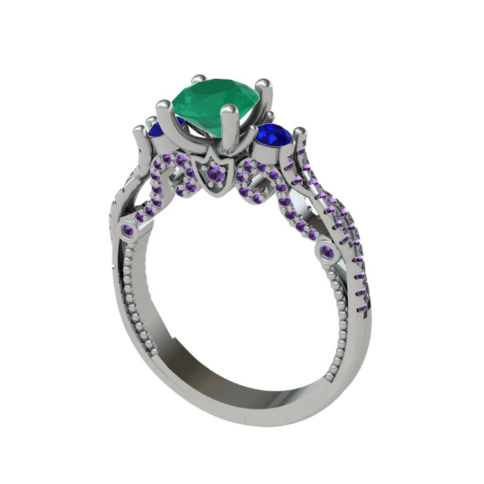Kök zümrüt, lab safir ve ametist 14 ayar beyaz altın yüzük