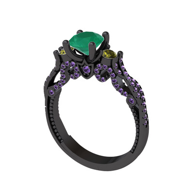 Kök zümrüt, peridot ve ametist 925 ayar siyah rodyum kaplama gümüş yüzük