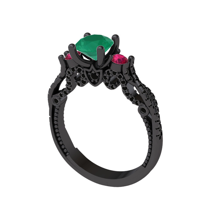 Kök zümrüt, rodolit garnet ve siyah zirkon 925 ayar siyah rodyum kaplama gümüş yüzük
