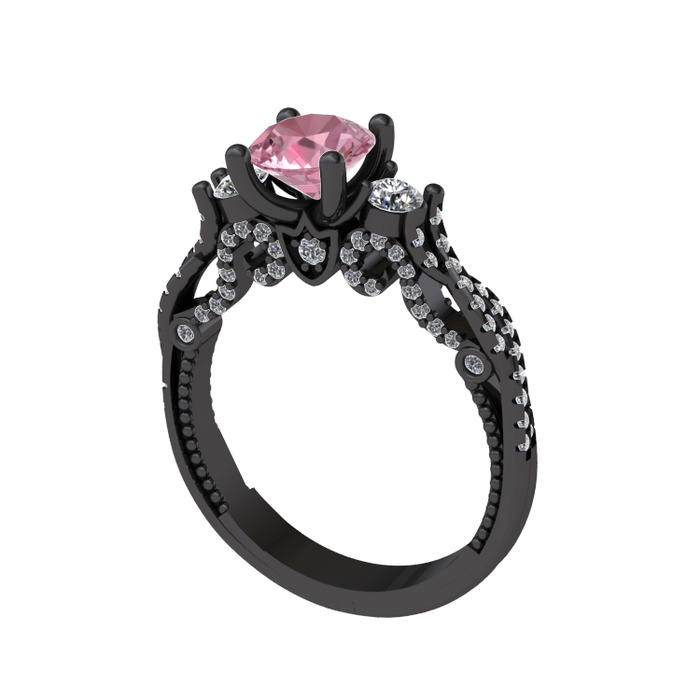 Pembe kuvars, beyaz zirkon ve swarovski 925 ayar siyah rodyum kaplama gümüş yüzük