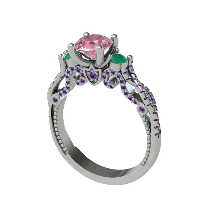 Pembe kuvars, kök zümrüt ve ametist 14 ayar beyaz altın yüzük