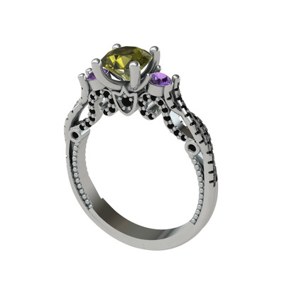 Peridot, ametist ve siyah zirkon 18 ayar beyaz altın yüzük