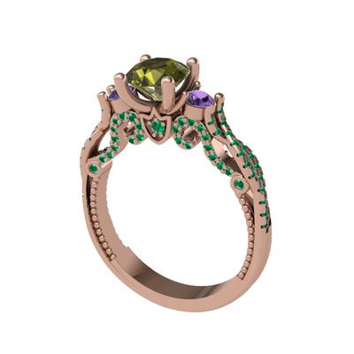Peridot, ametist ve yeşil kuvars 925 ayar rose altın kaplama gümüş yüzük