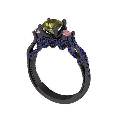 Peridot, pembe kuvars ve lab safir 925 ayar siyah rodyum kaplama gümüş yüzük