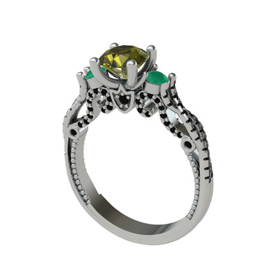 Peridot, yeşil kuvars ve siyah zirkon 18 ayar beyaz altın yüzük