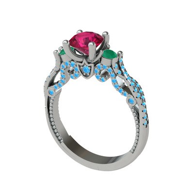 Rodolit garnet, kök zümrüt ve akuamarin 18 ayar beyaz altın yüzük