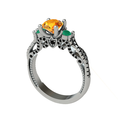 Sitrin, kök zümrüt ve siyah zirkon 8 ayar beyaz altın yüzük