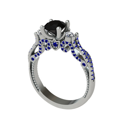 Siyah zirkon, pırlanta ve lab safir 14 ayar beyaz altın yüzük (0.22 karat)