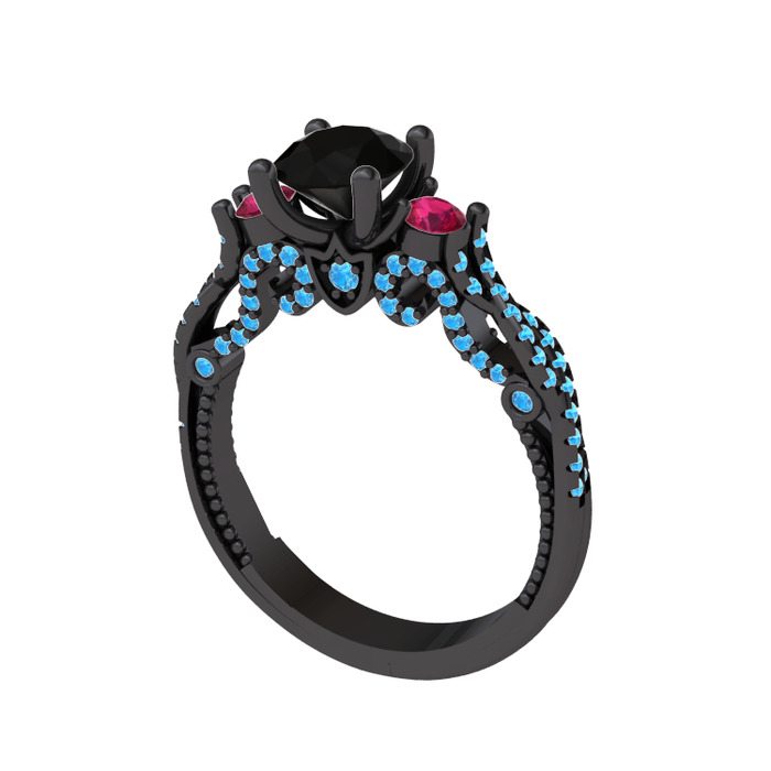 Siyah zirkon, rodolit garnet ve akuamarin 925 ayar siyah rodyum kaplama gümüş yüzük