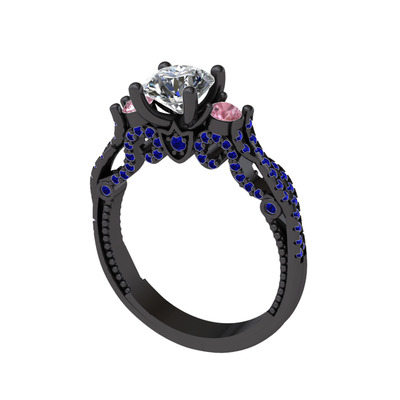 Swarovski, pembe kuvars ve lab safir 925 ayar siyah rodyum kaplama gümüş yüzük