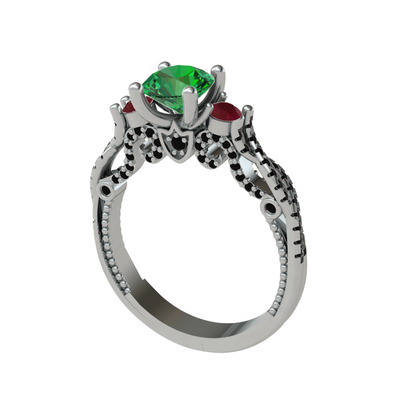 Yeşil kuvars, kök yakut ve siyah zirkon 8 ayar beyaz altın yüzük