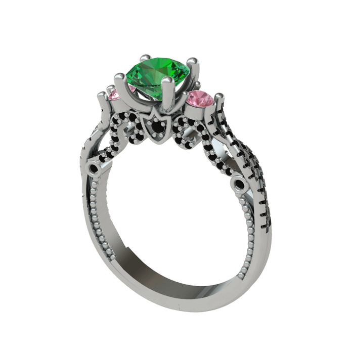 Yeşil kuvars, pembe kuvars ve siyah zirkon 14 ayar beyaz altın yüzük